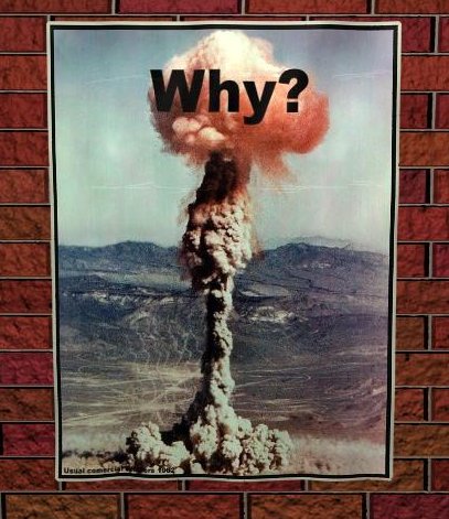 | Between 1951 and 1958 the US Government detonated 119 atomic bombs above ground at the Nevada Test Site. The above photograph is of the Buster-Jangle Charlie test. "Volunteer" soldiers were put as close as 2000 yards from these blasts and the Downwinders, the people who lived in the path of the fallout, were continually fed lies about the danger to themselves and their children. It's no surprise that many have died and many more are still suffering from the effects of cancers caused by the tests. No surprise either that the powers that be still will not accept responsibility. And now India and Pakistan are subjecting their people to the same risks. Smart move guys. |