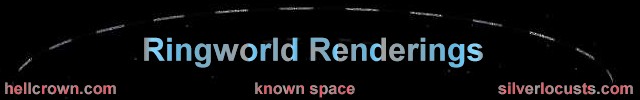 What is the Ringworld The Ringworld is an imaginary artificial structure imagined and written about by Larry Niven. If you only read one science fiction book in your life my personal recommendation would be "Ringworld". And if you get hooked there is more on the Ringworld in "Ringworld Engineers" and "Ringworld Throne". So what is it. Well, try to imagine the Earth traveling around the sun, drawing out a huge circle as it goes. Now imagine that there are 125 Earths stacked pole on pole upon each other, and further that these Earths are laying out behind them as they travel a ribbon of material a million miles across with one side facing the sun and the other facing away. When the orbit around the sun is complete there is a vast ring around the sun. Now sculpt the inside surface with mountains and rivers, plains and oceans and spin it around to create some 'gravity'. Add thousand mile high walls at the edges of the ring to hold in an atmosphere and there you have it. The Ringworld, with the surface area of three million Earths. More living space than you would find around a million stars. Shadow squares On the Ringworld the sun is always at midday, (unless something is seriously wrong) and to simulate the cycle of day and night that the inhabitants of natural, spherical worlds enjoy the makers of the Ringworld put a string of black squares linked by strong wires into orbit around the central star at a distance of about the orbit of Mercury. These squares cast huge shadows onto the surface of the Ringworld, which, as they move simulate day and night. The Arch One consequence of the structure of the Ringworld is that wherever you stand on its surface you will be able to see, in the very far distance, ahead of you and behind you the Ring rising up above you. During the day it is faint and the sun will obscure it higher up, but at night it is a glorious sight as alternate strips of lit and shadowed Ringworld surface rise up to meet at the zenith. It will look as if a huge arch stands over you. An arch whose feet you could never reach. Some figures 1 Day is 30 hours 1 Turn is 7.5 days (the time it takes the Ringworld to revolve once) 75 Days is ten Turns is 1 Falan Its mass is 2x10exp27 kg Its radius is 95 million miles Its circumference is 597 million miles Its width is 997,000 miles Big ain't it - go here to see how big! Some images The following images were all created in one evening and are a first draft attempt at representing the vast structure described above. If you have any thoughts on their realism and how I can improve them then I would like to hear from you. |